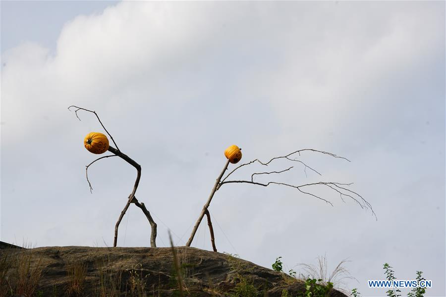 Photo taken on Oct. 2, 2018 shows pumpkins at Spooky Pumpkin Garden inside the New York Botanical Garden in New York, the United States. The Spooky Pumpkin Garden is a temporary Halloween theme garden that features more than 100 scarecrows and nearly 1,000 unusual pumpkins. (Xinhua/Lin Bilin)