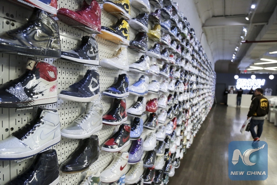 File Photo: A customer looks around at a store of Stadium Goods in New York, the United States, on Nov. 8, 2017. Stadium Goods is a New York City-based marketplace that sells the most sought after footwear, apparel and other hard-to-find items on behalf of their owners both online and in its retail store. In August 2016, the company opened a store on Tmall, China's largest B2C online platform, and has since seen fast market expansion. (Xinhua/Wang Ying)