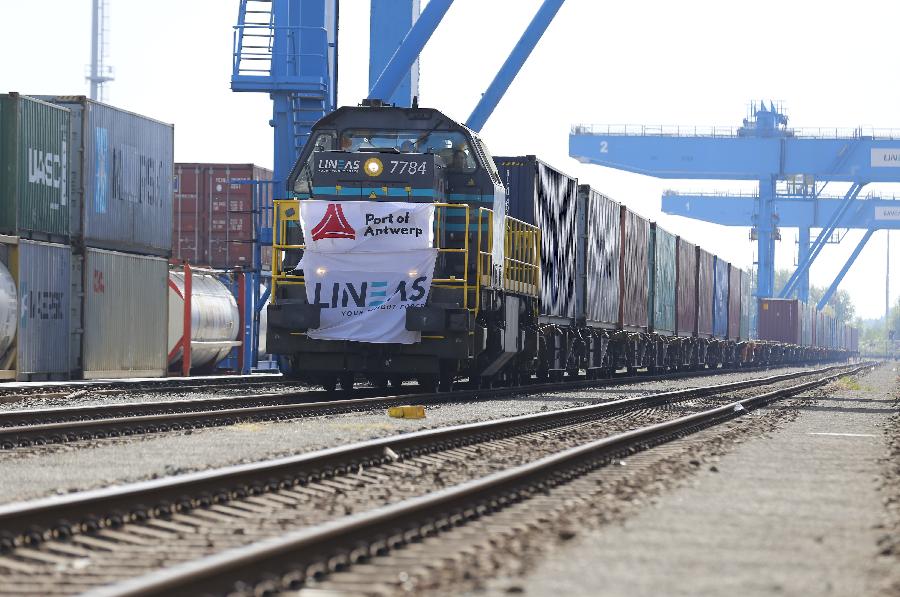 The China-Europe freight train from Tangshan City in north China arrives in Antwerp of Belgium May 12, 2018. (Xinhua/Ye Pingfan)