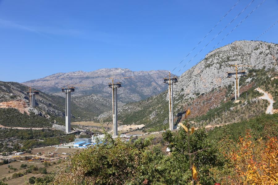 The Moracica bridge of Montenegro's first highway is under construction in a location about 14 kilometers north of Podgorica, capital of Montenegro, Sept. 22, 2018. (Xinhua/Wang Huijuan)