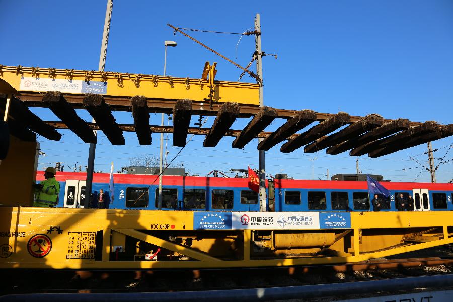 Photo taken on Nov. 28, 2017 shows the opening ceremony of the construction of the Belgrade-Stara Pazova segment of the Belgrade-Budapest railway, in Belgrade, Serbia. (Xinhua/Wang Huijuan)