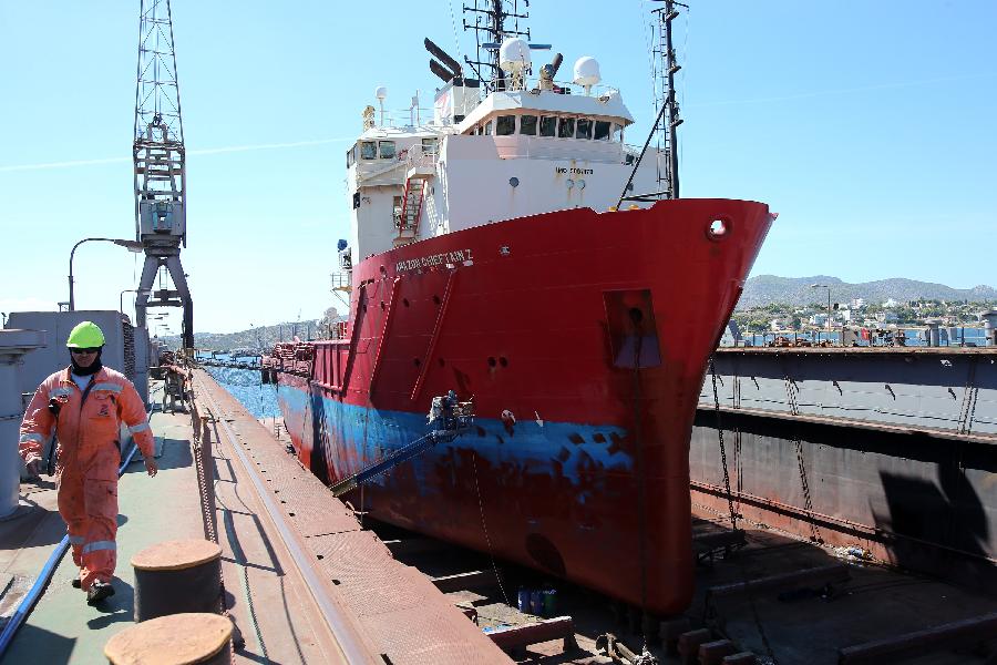 A Greek employee works at the shipyard of the Piraeus Port Authority in Perama of Greece Sept. 21, 2018. (Xinhua/Marios Lolos)