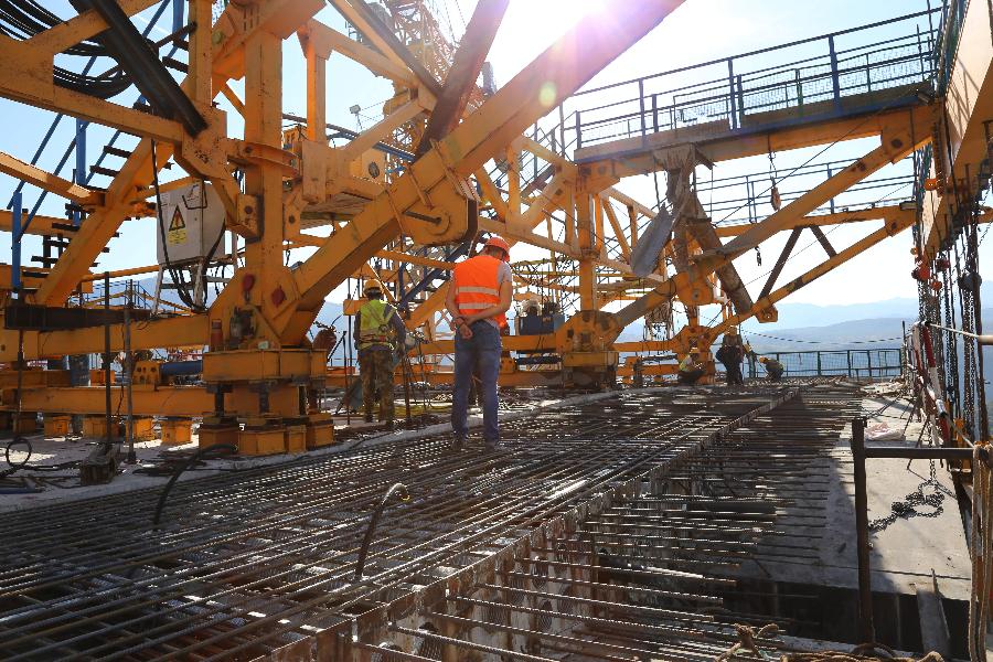 People work at the construction site of the Moracica bridge of Montenegro's first highway in a location about 14 kilometers north of Podgorica, capital of Montenegro, on Sept. 22, 2018. (Xinhua/Wang Huijuan)
