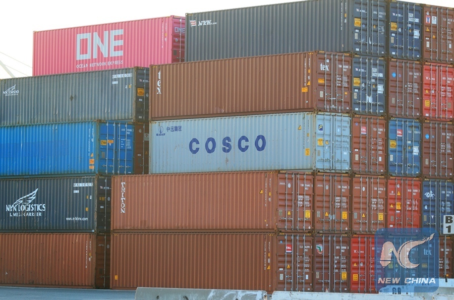 A container of China COSCO Shipping Corporation Limited is seen at the Port of Long Beach, Los Angeles County, the United States, Aug. 23, 2018. (Xinhua/Li Ying)