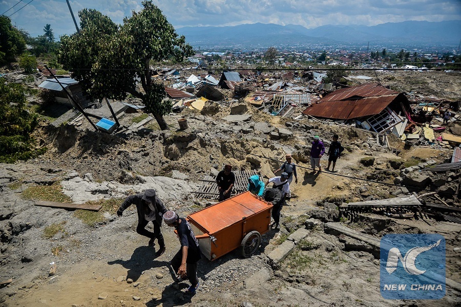 People salvage useable items from the debris of houses in Balaroa village after earthquake and tsunami in Palu, Central Sulawesi, Indonesia, on Oct. 2, 2018. (Xinhua/Iqbal Lubis)