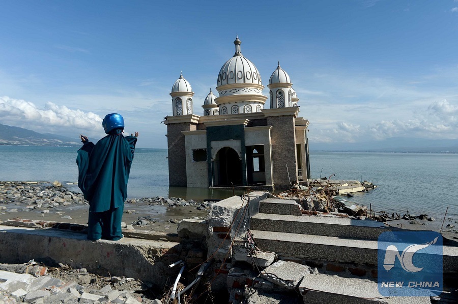 A woman stands near the debris of a damaged mosque on Talise beach in Palu, Central Sulawesi,Indonesia. (Xinhua/Agung Kuncahya B.)