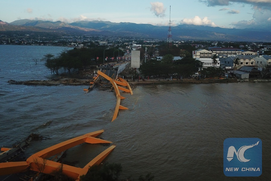 Photo taken on Oct. 8, 2018 shows the aerial view of a collapsed bridge after the earthquake and tsunami in Palu, Central Sulawesi, Indonesia. (Xinhua/Wang Shen)
