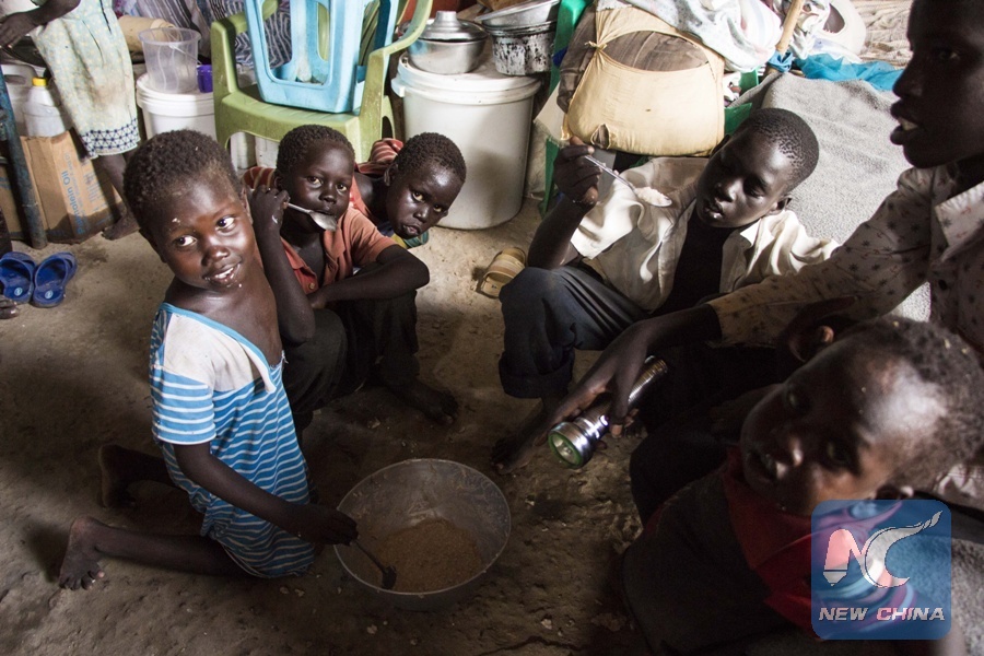 Children are seen eating at Mangaten camp in Juba, capital of South Sudan, Sept. 14, 2018. The United Nations Mission in South Sudan and humanitarian agencies have relocated about 3500 internally displaced people from the UN Protection of Civilians site (POCs) in Juba to Mangaten in the community. (Xinhua/Denis Elamu)