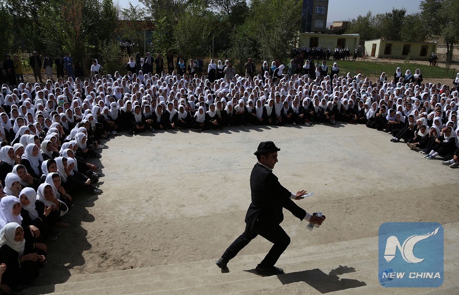 Afghanistan's Charlie Chaplin, Karim Asir performs during a show at a local school in Kabul, capital of Afghanistan, Oct.10, 2018. (Xinhua/Rahmat Alizadah)