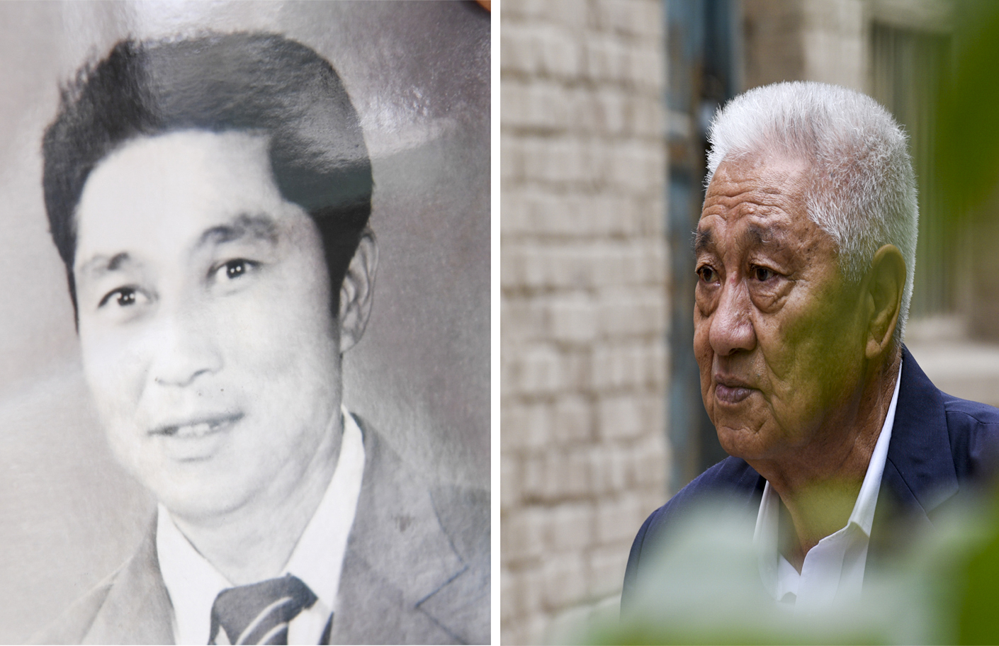 Combo photo shows Imam Memet, the first head of the forestry station of Kekeya, when he taking office (L) and after retirement (R). (Xinhua/Hu Huhu)