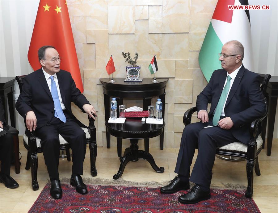RAMALLAH, Oct. 23 (Xinhua) -- Visiting Chinese Vice President Wang Qishan called here Tuesday for concerted global efforts to push for a just end to the Palestinian issue on the basis of a two-state solution.