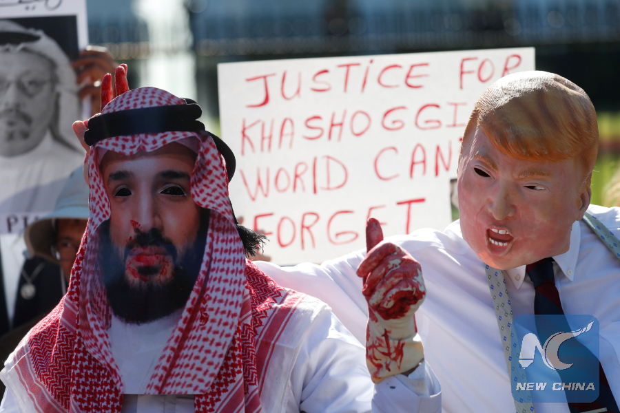 Activists dressed as Saudi Crown Prince Mohammad bin Salman and U.S. President Donald Trump participate in a demonstration calling for sanctions against Saudi Arabia over disappearance of Saudi journalist Jamal Khashoggi, outside the White House in Washington, U.S., Oct. 19, 2018. (Reuters photo)