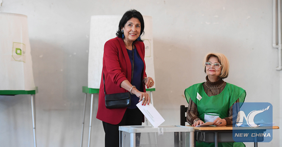 Independent candidate Salome Zurabishvili (L) casts her ballot at a polling station in Tbilisi, Georgia, Oct. 28, 2018. (Xinhua/Tamuna Kulumbegashvili)