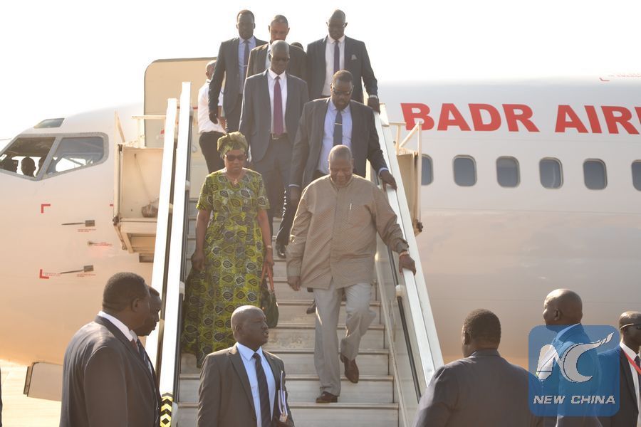 South Sudan's main opposition leader Riek Machar (R, front) and his wife arrive before the country's peace day celebration at Juba International Airport in Juba, capital of South Sudan, Oct. 30, 2018. (Xinhua/Daniel Majack)