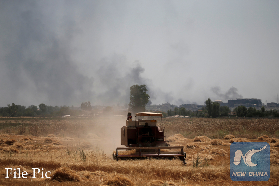 Smoke billows from the positions of the Islamic State militants as a harvester gathers the wheat crop from a field in western Mosul, Iraq, on June 19, 2017. (Reuters file photo)