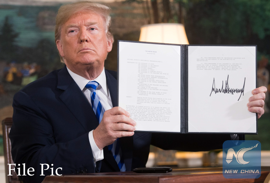 In this file photo taken on May 8, 2018, U.S. President Donald Trump signs a document reinstating sanctions against Iran after announcing the U.S. withdrawal from the Iran Nuclear deal, in the Diplomatic Reception Room at the White House in Washington, DC. (AFP file photo)