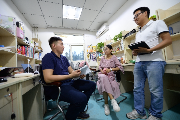 Marat Muratkhan and postgraduate student Chen Yingying discuss experiment in laboratory. (Xinhua/Li Yibo)