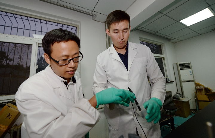 Marat Muratkhan (R) and another doctoral student Wang Tao make an experiment in laboratory. (Xinhua/Li Yibo)