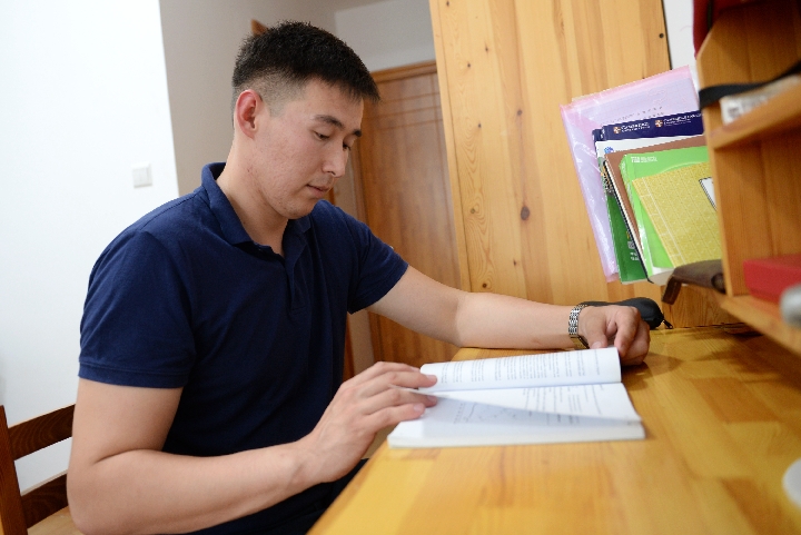 Marat Muratkhan reads in dormitory. (Xinhua/Li Yibo)