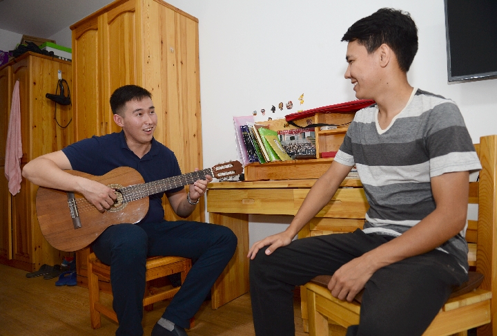 Marat Muratkhan (L) plays the guitar in dormitory as Abdessan Rauan, another student from Kazakhstan, looks on. (Xinhua/Li Yibo)