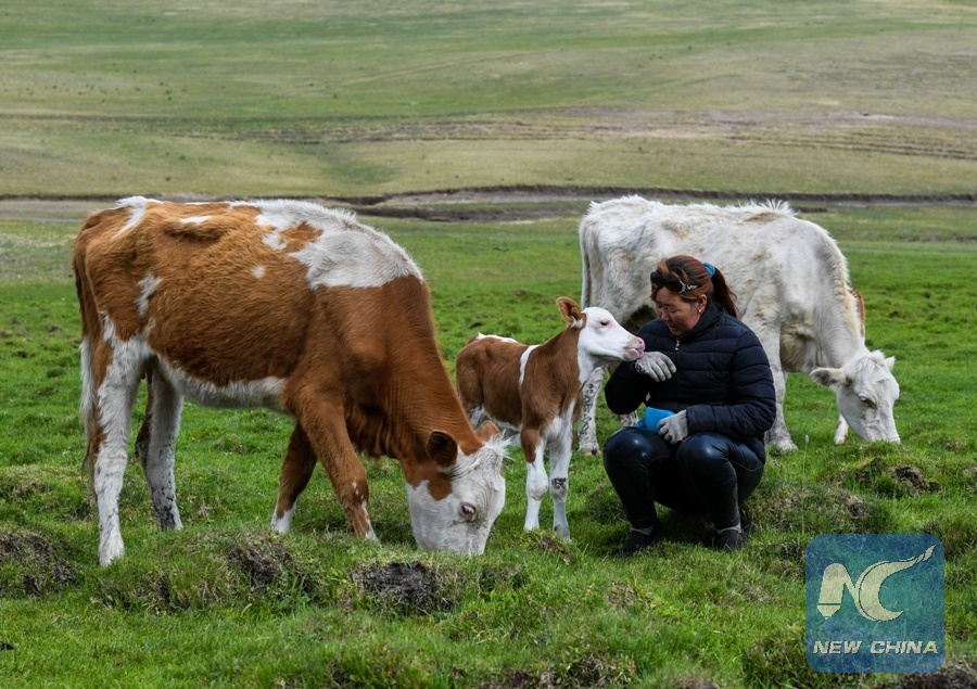 Mudan, Erden's sister, herds cattle at the summer pasture at the Ar Horqin Banner in Chifeng City, north China's Inner Mongolia Autonomous Region, June 5, 2018. June 5 was the day for Erden's family to move their cattle to a summer pasture, about 40 kilometers away from their family. (Xinhua/Peng Yuan)