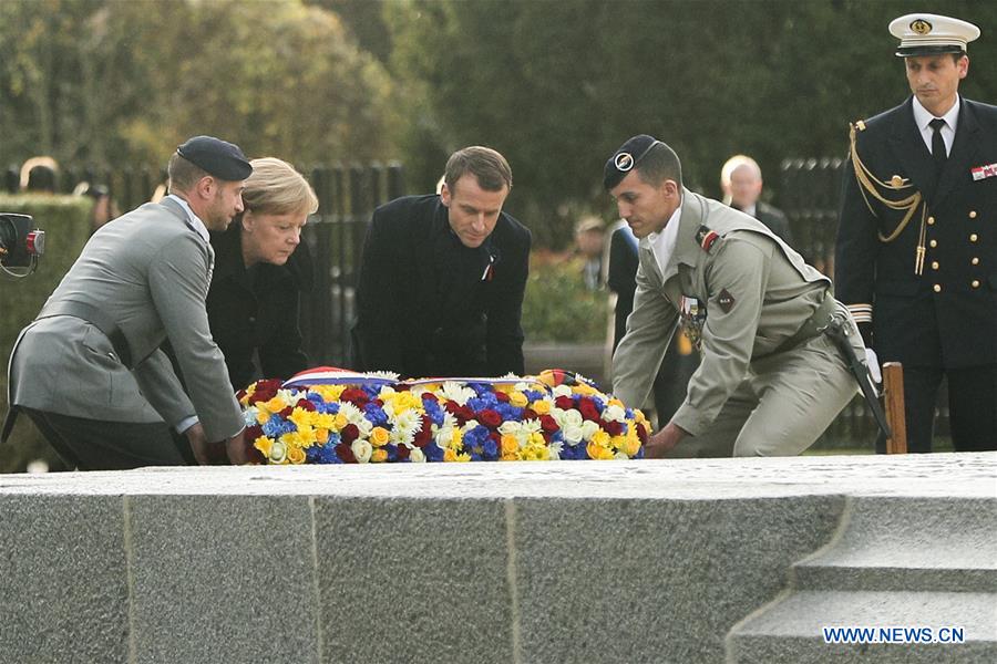 PARIS, Nov. 10 (Xinhua) -- French President Emmanuel Macron and German Chancellor Angela Merkel clasped hands on Saturday during a solemn joint ceremony at a historic site, in a vow of peace and unity.