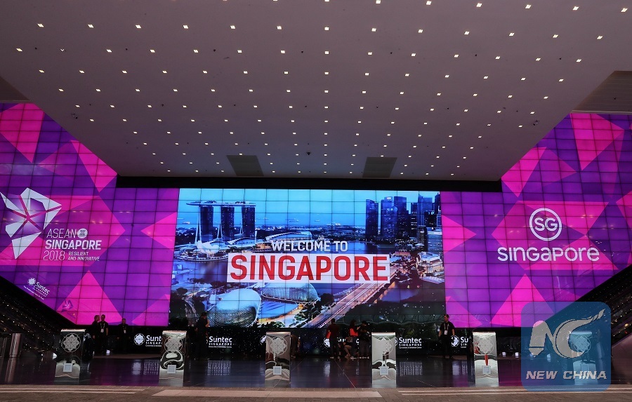 A signboard about Association of Southeast Asian Nations (ASEAN) Summit is seen in Suntec Singapore Convention & Exhibition Centre in Singapore on Nov. 12, 2018. (Xinhua/Li Gang)
