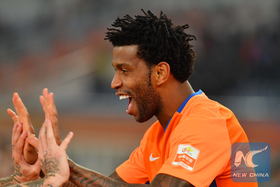 Shandong Runeng's defender Carlos Gilberto Nascimento Silva is celebrating his goal in a Chinese Super League match against Jiangsu Suning.