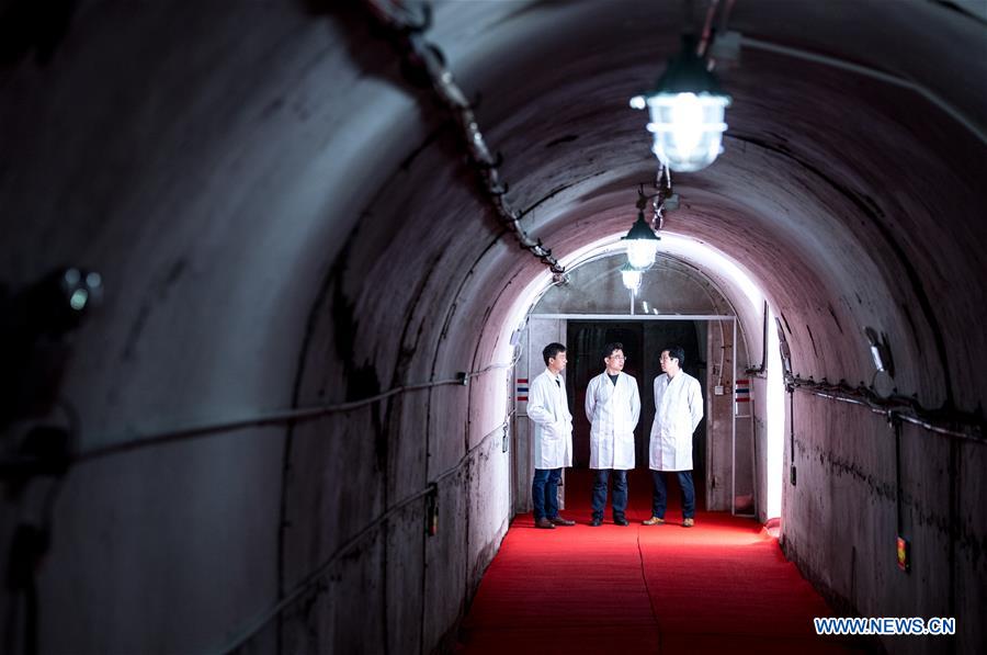 Scientists Tu Liangcheng (L), Hu Zhongkun (C) and Zhou Zebing discuss at the gravitation center of Huazhong University of Science and Technology (HUST) in Wuhan, central China's Hubei Province, March 27, 2018. (Xinhua/Xiong Qi)