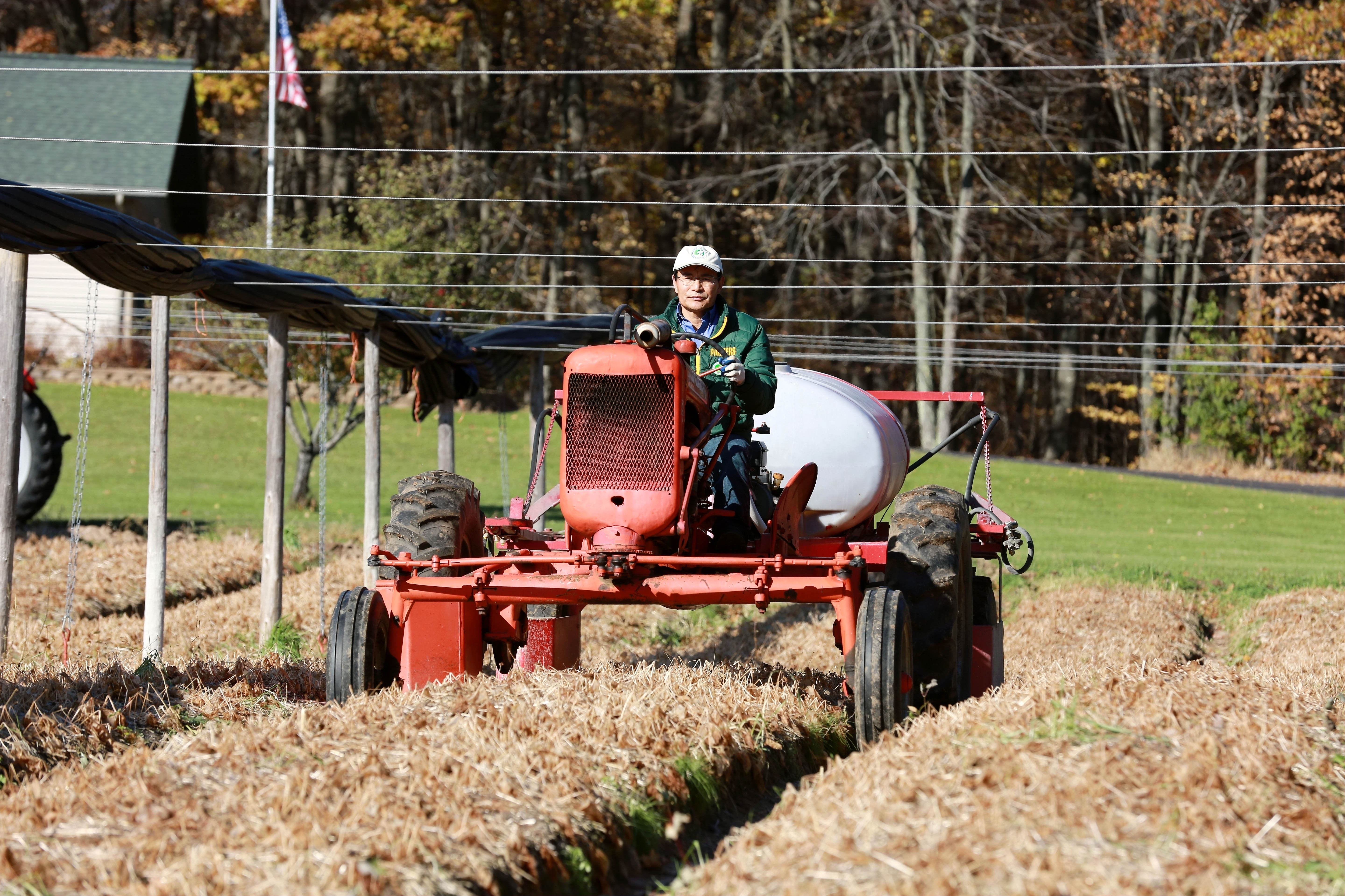 Jiang Mingtao, founder of Marathon Ginseng International Inc., drives a tractor at a ginseng farm in Marathon County, Wisconsin, the United States, on Oct. 22, 2018. (Xinhua/Wang Ping)(wyo)