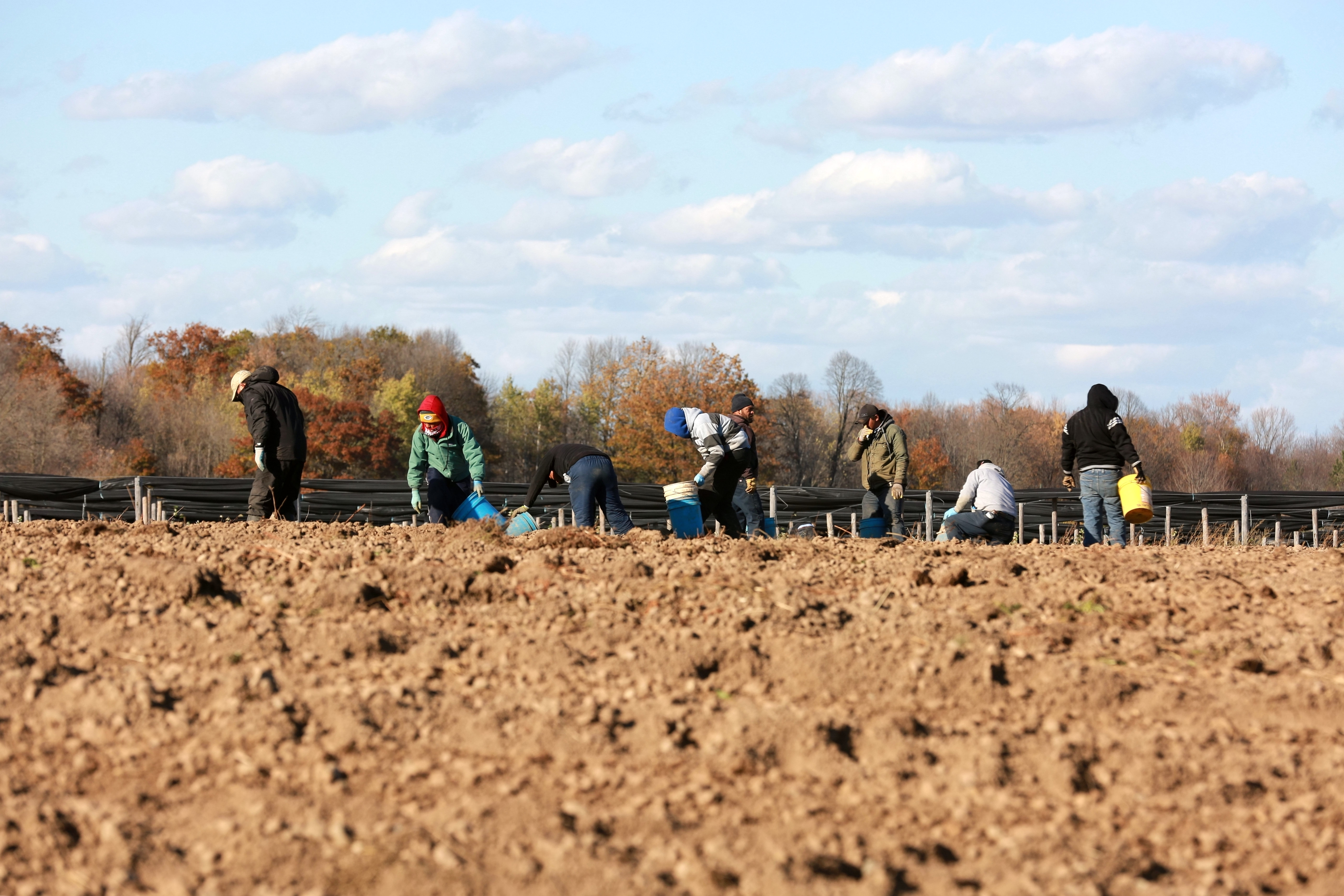 Local workers dig ginseng at a ginseng farm in Marathon County, Wisconsin, the United States, Oct. 22, 2018. (Xinhua/Wang Ping)(wyo)