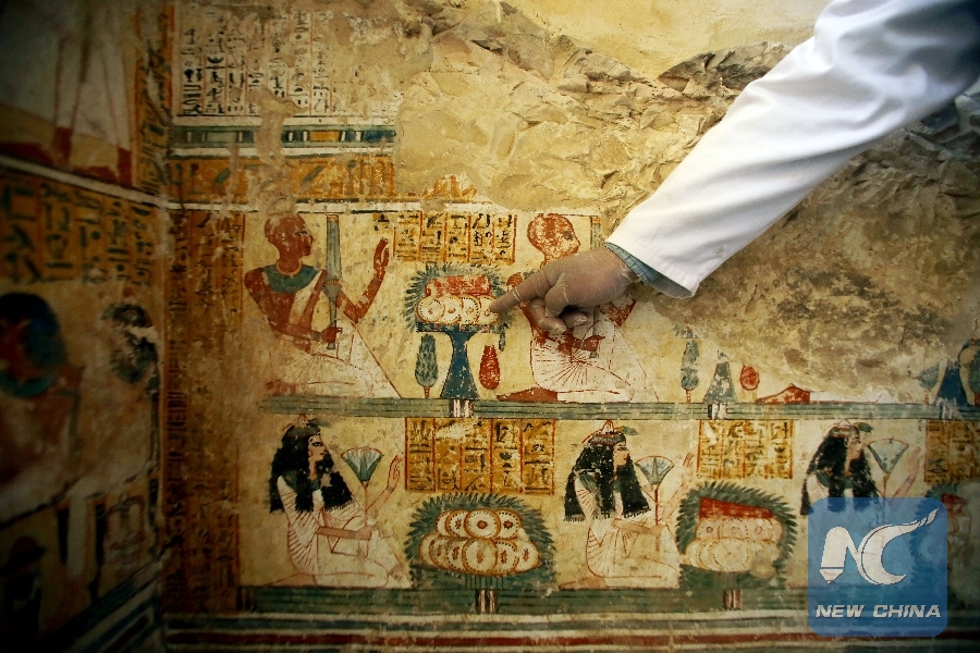 An archeologist points at a mural inside a tomb unearthed by an Egyptian archeological mission working at al-Asassif area on the West Bank of Luxor, Egypt, on Nov. 24, 2018. (Xinhua/Ahmed Gomaa)