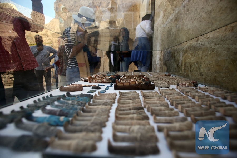 People look at artifacts unearthed by an Egyptian archeological mission working at al-Asassif area on the West Bank of Luxor, Egypt, on Nov. 24, 2018. (Xinhua/Ahmed Gomaa)