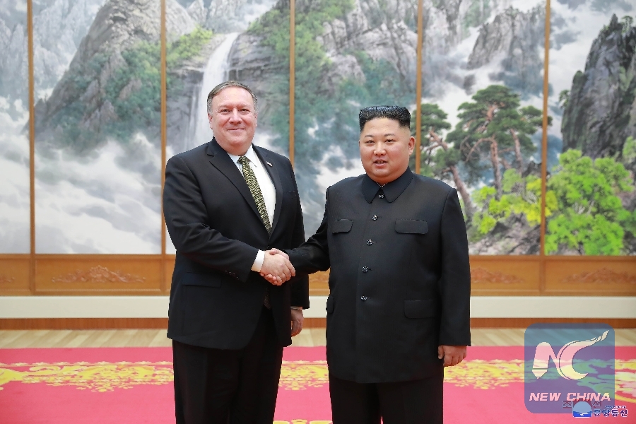 File photo provided by the Korean Central News Agency (KCNA) shows top leader of the Democratic People's Republic of Korea (DPRK) Kim Jong Un (R) shaking hands with visiting U.S. Secretary of State Mike Pompeo in Pyongyang, DPRK, Oct. 7, 2018. (Xinhua/KCNA)