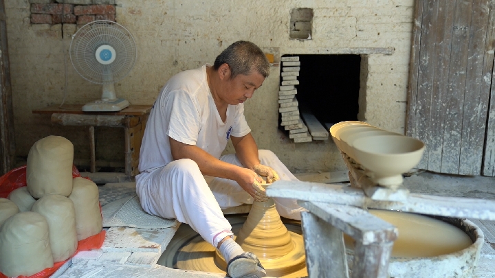 Ceramic artist Yin Shengliang makes an unburned earthenware. (Xinhua/Zhou Mi)