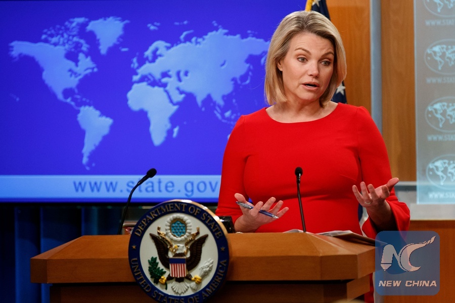 File Photo: U.S. State Department spokesperson Heather Nauert addresses a press briefing in Washington D.C., the United States, Aug. 15, 2018. (Xinhua/Ting Shen)