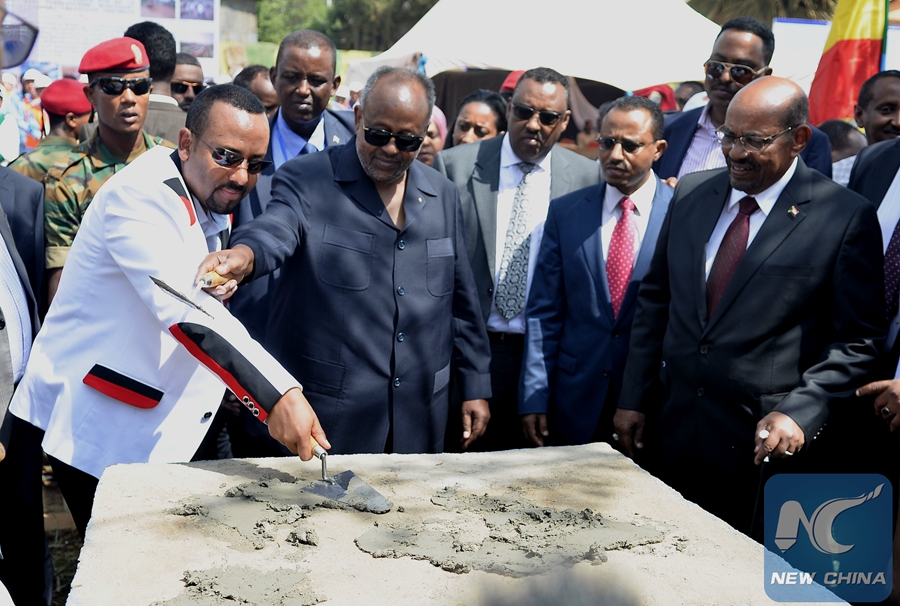 Ethiopian Prime Minister Abiy Ahmed (L), Djiboutian President Ismail Omar Guelleh (C), and Sudanese President Omar al-Bashir (R) on Dec. 9, 2018, inaugurate a Chinese-contracted major road project as the Ethiopian government aspires to connect strategic towns in western Ethiopia. (Xinhua/Michael Tewelde)