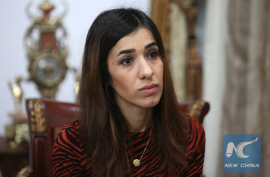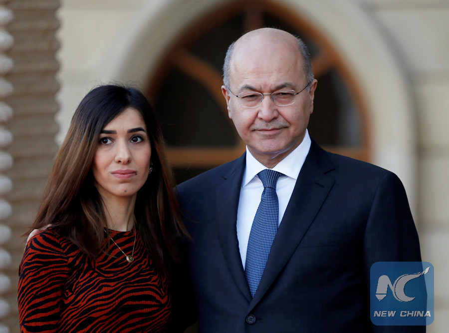 BAGHDAD, Dec. 12 (Xinhua) -- Iraqi President Barham Salih on Wednesday met with Nadia Murad, an Iraqi female winner of Noble Prize from the Iraqi Yazidi minority in Baghdad, and called for ending disputes in the Middle East region to eradicate terrorism.