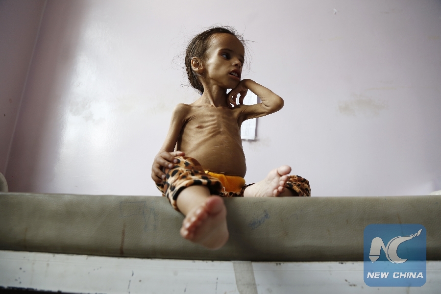 File Photo: A malnourished 4-year girl sits on a bed as she waits to be weighed while she receives treatment at a malnutrition department in a hospital in Sanaa, Yemen, on Sept. 2, 2018. Millions of people in the war-torn Yemen are unable to secure one meal a day. (Xinhua/Mohammed Mohammed)