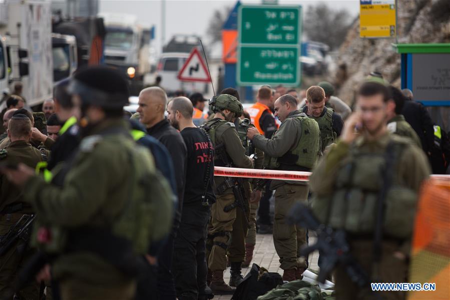 Israeli forces inspect the site of a Palestinian drive-by shooting attack outside the West Bank settlement of Givat Asaf, northeast of Ramallah, on Dec. 13, 2018. Earlier Thursday, two Israeli soldiers were killed and two others injured in a shooting attack carried out by unknown gunmen near Ramallah, according to the spokesman. (Xinhua/JINIPIX)