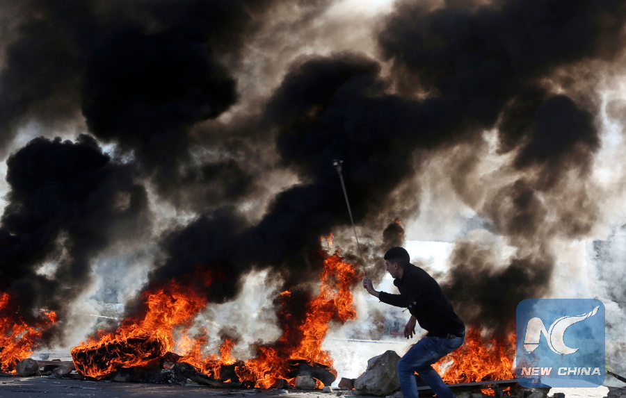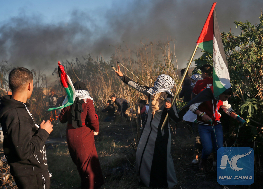 RAMALLAH/GAZA, Dec. 14 (Xinhua) -- A Palestinian was killed and dozens of others injured on Friday in a daylong fierce clashes between angry Palestinian demonstrators and Israeli soldiers across the West Bank and in the eastern Gaza Strip close to the border with Israel, medics said.