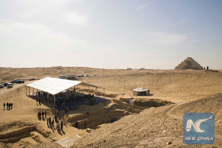 Photo taken on Dec. 15, 2018 shows the site of the press conference near a tomb in Saqqara Necropolis in Giza, Egypt. (Xinhua/Wu Huiwo)