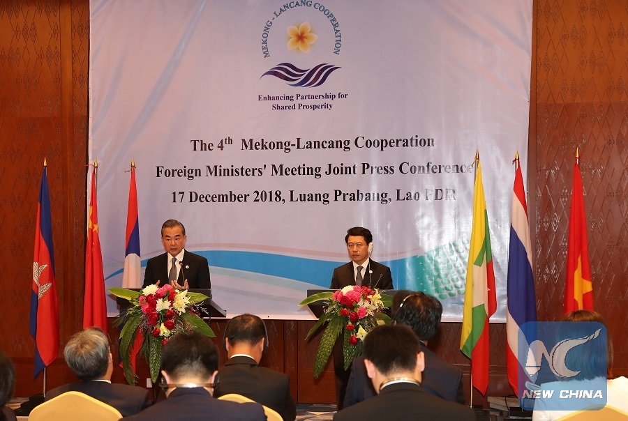 Chinese State Councilor and Foreign Minister Wang Yi (L) and Lao Foreign Minister Saleumxay Kommasith attend the joint press conference after "the 4th Mekong-Lancang Cooperation Foreign Ministers' Meeting" in Luang Prabang, Laos, on Dec. 17, 2018. (Xinhua/Li Gang)