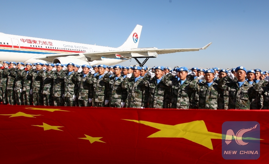 File Photo: Chinese PLA soldiers and officers for the new batch of peace-keeping mission to Lebanon take the oath in front of the Chinese national flag, at the international airport of Kunming, southwest China's Yunnan Province, Feb. 16, 2009. (Xinhua/Zhou Can)