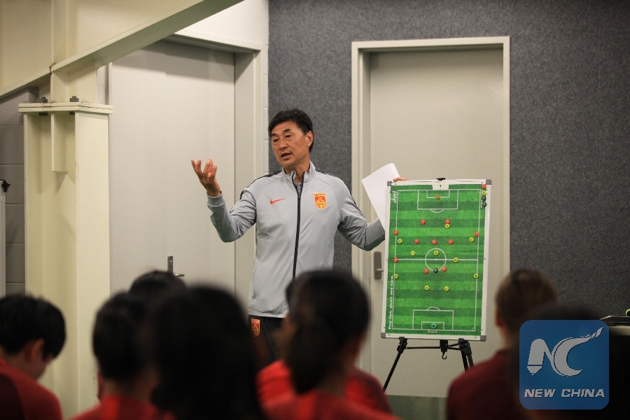 Head coach of Chinese women's Football team Jia Xiuquan explains the tactics ahead of a warm up match during the training in Australia on December 24, 2018. (Xinhua/Pan Xiangyue)