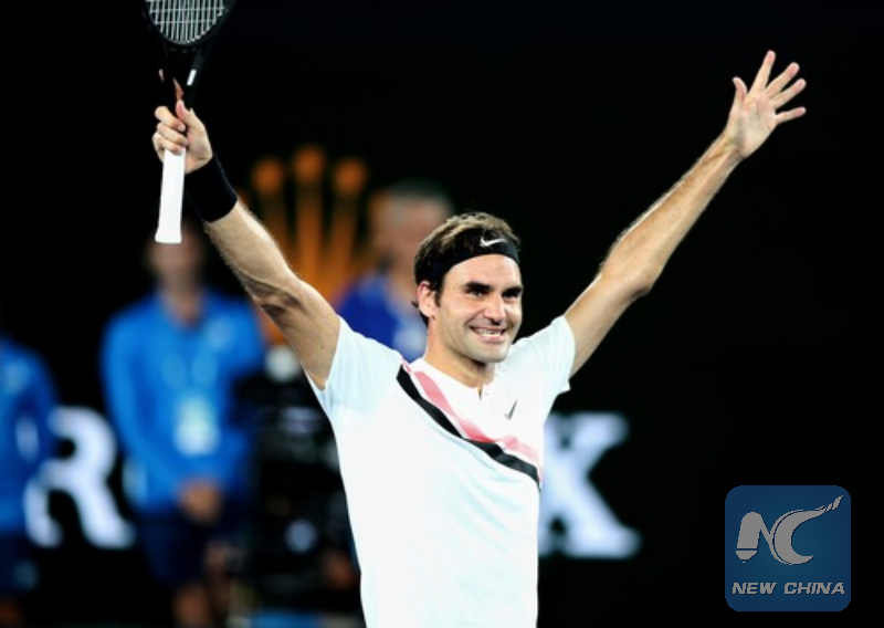 Photo taken on Jan. 28, 2018 shows Switzerland's Roger Federer celebrating after winning the men's singles final match against Croatia's Marin Cilic at Australian Open 2018 in Melbourne, Australia.