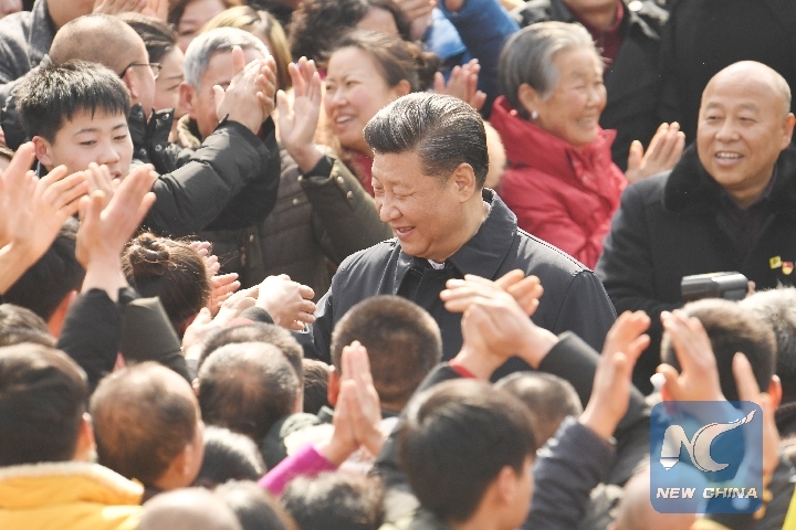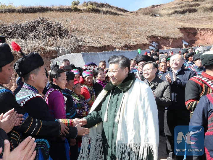 Chinese President Xi Jinping, also general secretary of the Communist Party of China Central Committee and chairman of the Central Military Commission, shakes hands with villagers as he visits Huopu, a new village for relocated residents from poor areas, in Jiefang Township in Zhaojue County of Liangshan Yi Autonomous Prefecture, southwest China's Sichuan Province, Feb. 11, 2018. (Xinhua/Ju Peng)