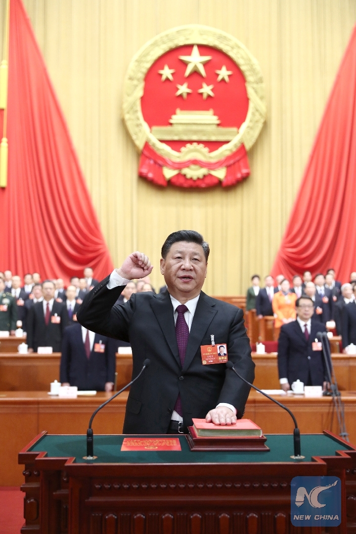 Xi Jinping takes a public oath of allegiance to the Constitution in the Great Hall of the People in Beijing, capital of China, March 17, 2018. Xi was elected Chinese president and chairman of the Central Military Commission of the People's Republic of China at the first session of the 13th National People's Congress, the national legislature. (Xinhua/Ju Peng)