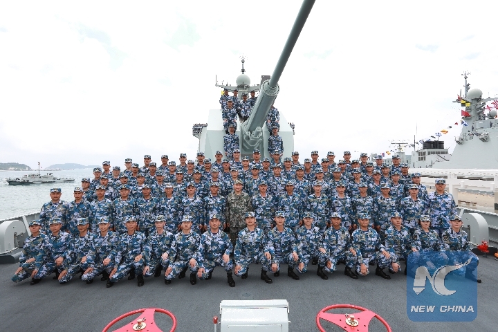 Chinese President Xi Jinping, also general secretary of the Communist Party of China Central Committee and chairman of the Central Military Commission, poses for a group photo with officers and soldiers on the missile destroyer Changsha on April 12, 2018. Xi reviewed the Chinese People's Liberation Army (PLA) Navy in the South China Sea and made a speech after the review. (Xinhua/Li Gang)