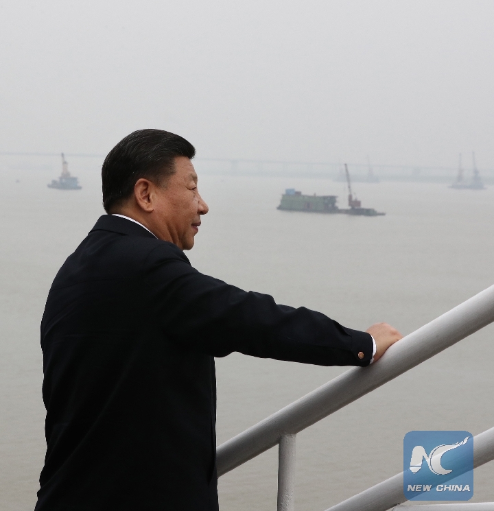 Chinese President Xi Jinping inspects the Chenglingji Hydrological Station, a major flood monitoring spot of the Yangtze River, for the ecological environment protection and economic development along China's longest river, in Yueyang City of central China's Hunan Province, April 25, 2018. (Xinhua/Ju Peng)